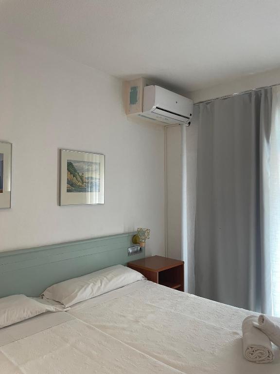 Cama doble en habitación luminosa con cuadros en la pared y cojines grises.