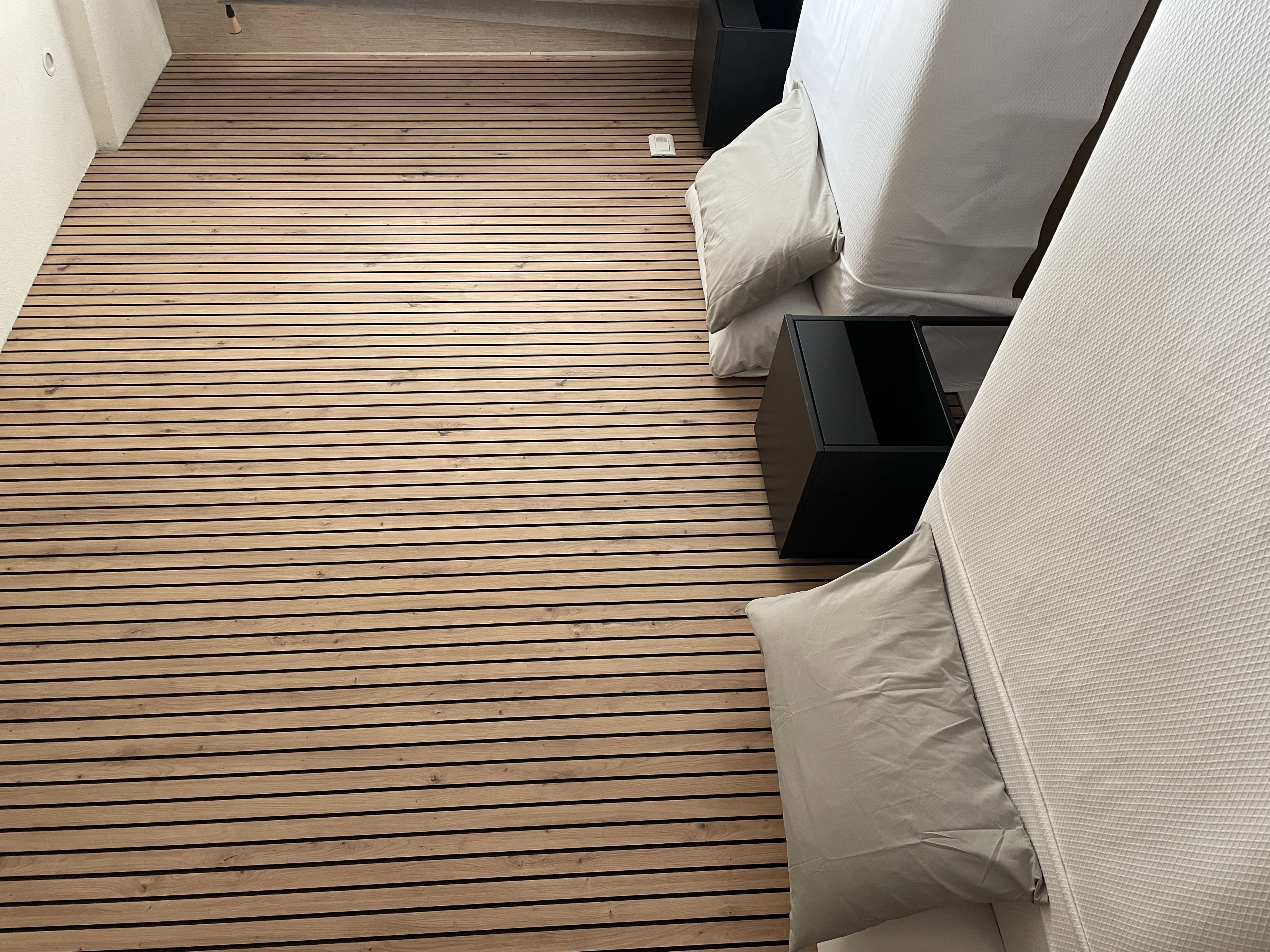 Cama con cobertor acolchado gris y cojín cilíndrico sobre sábanas blancas.